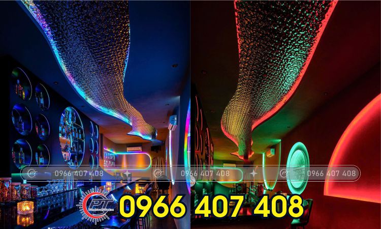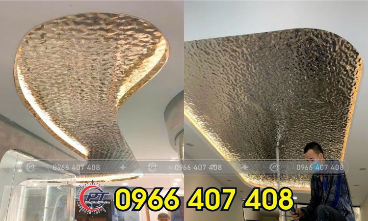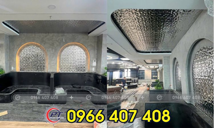 Trong những không gian rộng lớn hoặc cần sự phá cách Thi Công Tấm Inox Sóng Nước được sử dụng để ốp trần, tạo hiệu ứng ánh sáng lung linh và chiều sâu cho không gian, tạo điểm nhấn thẩm mỹ, đặc biệt trong các công trình thương mại.